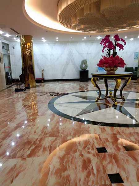 石材表面被轻微划伤,可采用轻度翻新工序进行翻新处理。使用800#金钢石水磨片加清水打磨十分钟,在打磨过程中加水,以保持地面湿润,
