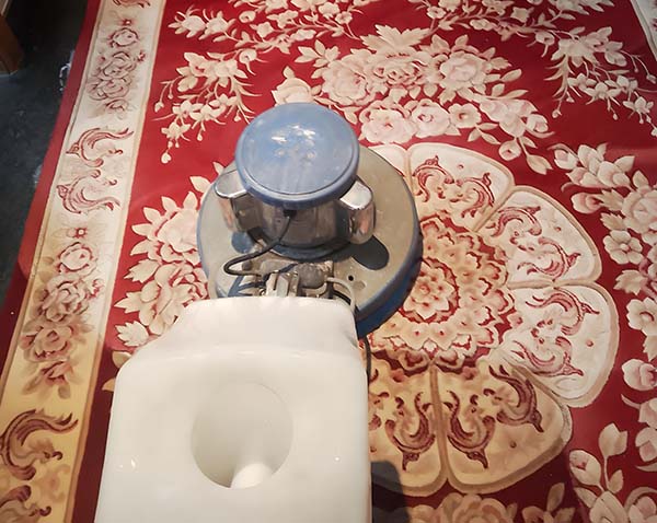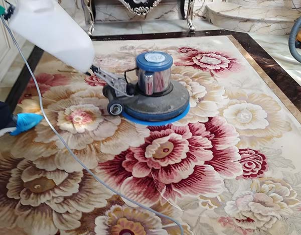 清洁液均匀地喷洒在地毯上,用刷子刷洗地毯表面,用吸水机或湿洗机抽取水分。