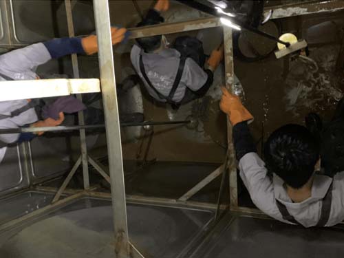 水箱清洗人员用专用工具水笼头进水箱进行冲刷