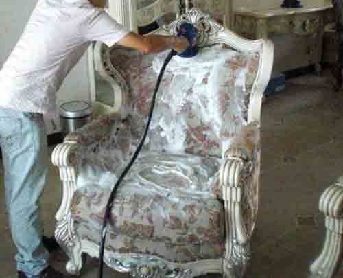 沙发清洗法1、将酒精倒入喷壶中,向有污渍的地方喷洒,2、等酒精浸入绒布中后,